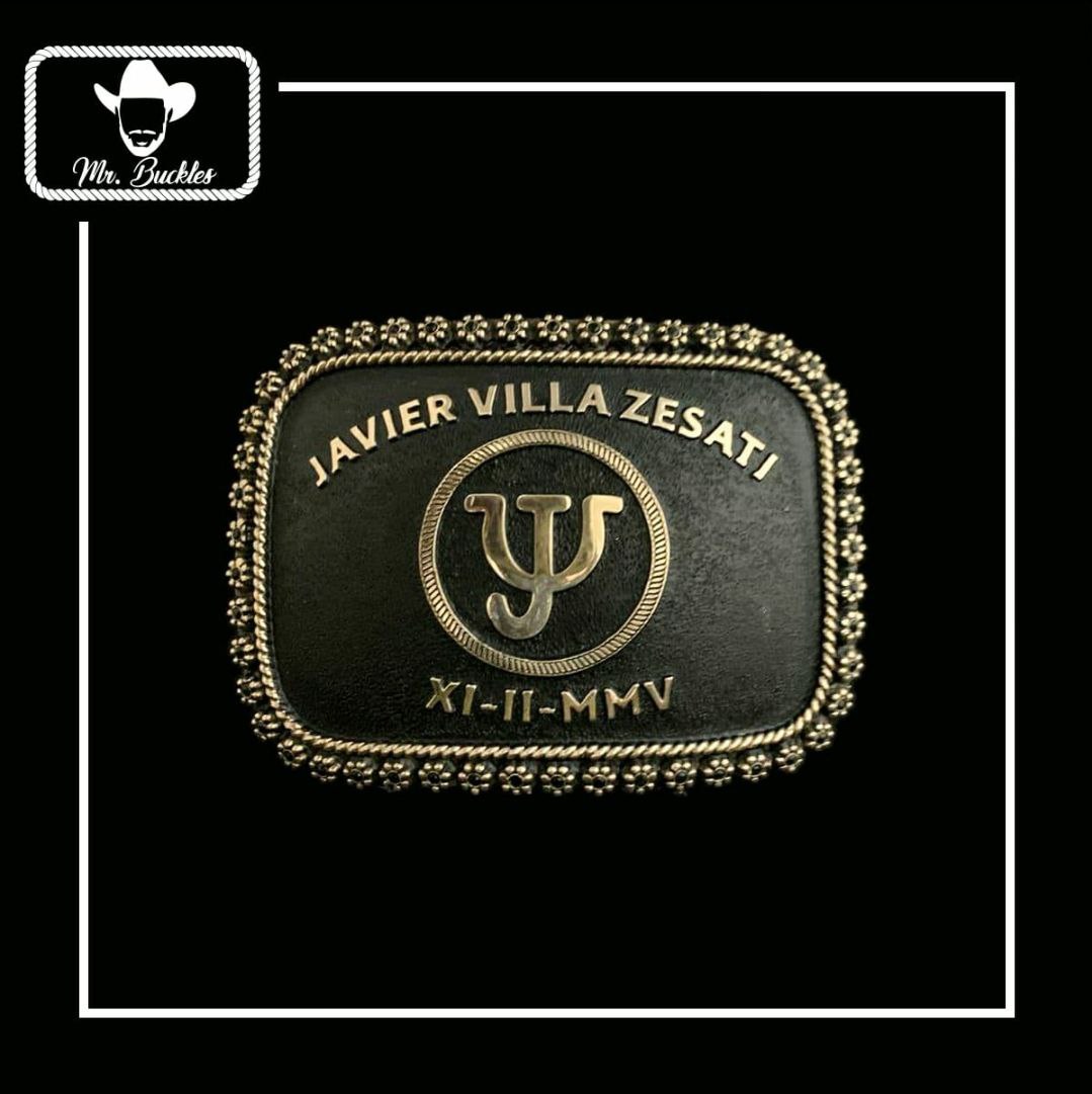 Beautifully handcrafted premium cut buckle, matte black background with golden brand, letters, rope, and berries, along with your choice of color stones, make this a premium cut buckle.