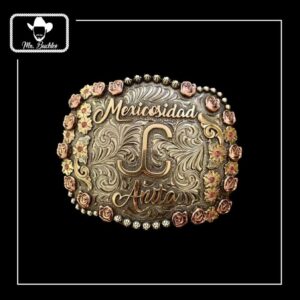Beautifully handcrafted premium cut buckle, matte black textured background with golden roses and brand along with silver scrolls and marbles, makes this a premium cut buckle.