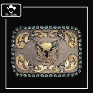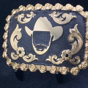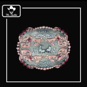 Beautifully handcrafted premium cut buckle, engraved background with your choice of color stones, along with a silver brand, rope and scrolls make this a premium cut buckle.